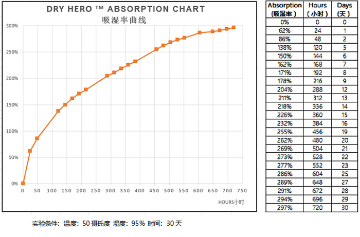 Dry Hero干燥剂吸湿能力可达到自身重量300%,吸潮能力是普通干燥剂的3-4倍。